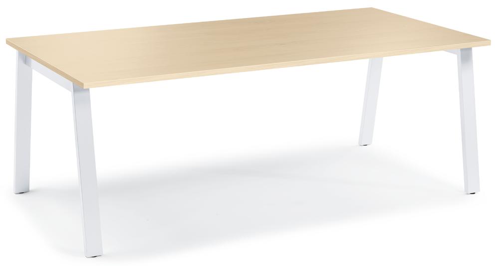 Platte Holzdekor Ahorn, Plattenstärke 25 mm, A-Fuß-Stahlgestell, Gestellfarbe Weiß RAL 9016, inkl. Bodenausgleichsschrauben zum Ausgleich von Bodenunebenheiten +10 mm verstellbar, Breite 2000 x Tiefe 1000 x Höhe 735 mm, Gewicht 55 kg.