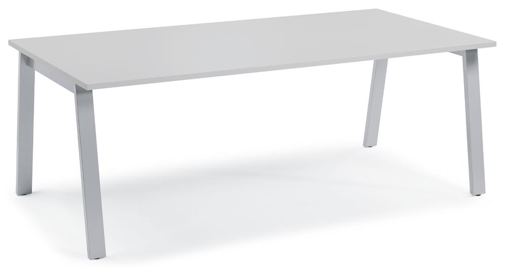 Platte Holzdekor Lichtgrau, Plattenstärke 25 mm, A-Fuß-Stahlgestell, Gestellfarbe Alusilber RAL 9006, inkl. Bodenausgleichsschrauben zum Ausgleich von Bodenunebenheiten +10 mm verstellbar, Breite 2000 x Tiefe 1000 x Höhe 735 mm, Gewicht 55 kg.