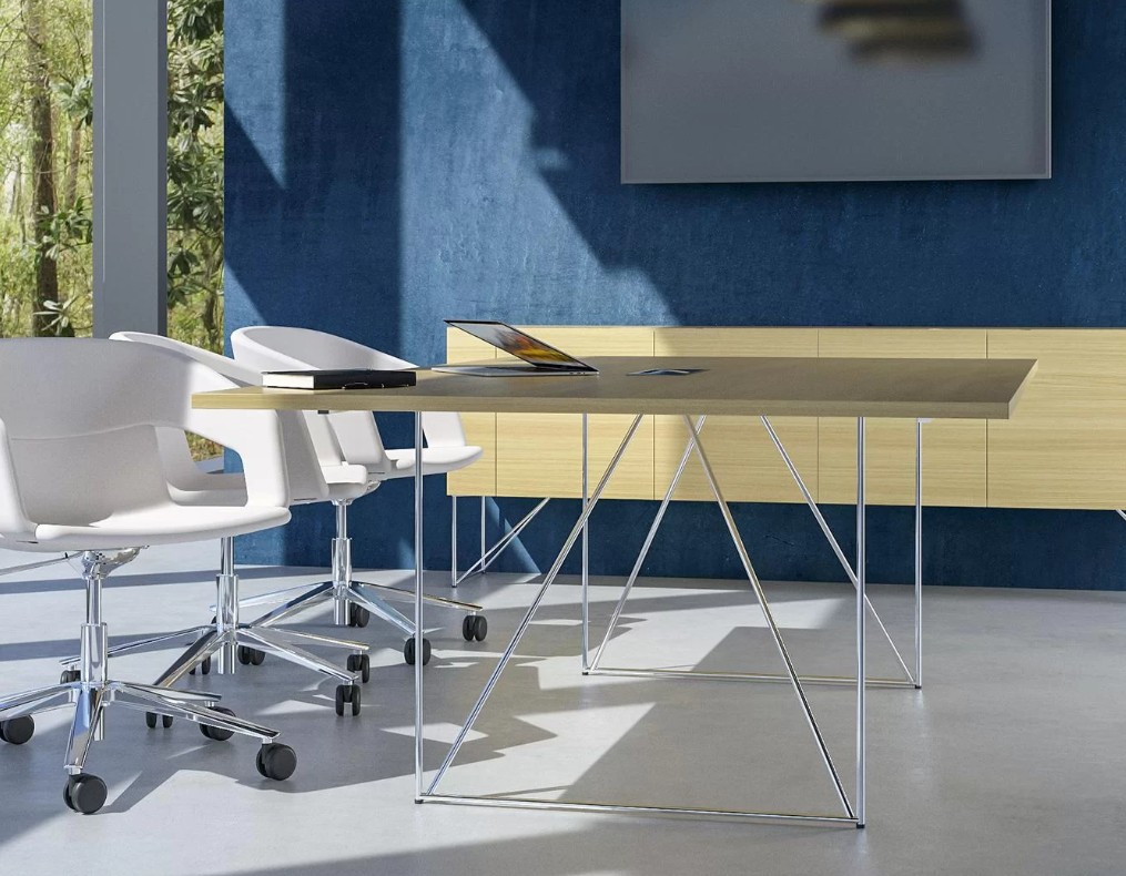 Die außergewöhnlichen Tische der Desing-Serie mit ihren dünnen Metallbeinen vermitteln das Gefühl der Leichtigkeit und garantieren gleichzeitig Langlebigkeit und Stabilität. Das minimalistische Design, die durchdachten Lösungen, die Kombination von verschiedenen Oberflächentexturen – all dies trägt zu mehr kreativer Freiheit für Architekten bei, die Büroräume erschaffen.