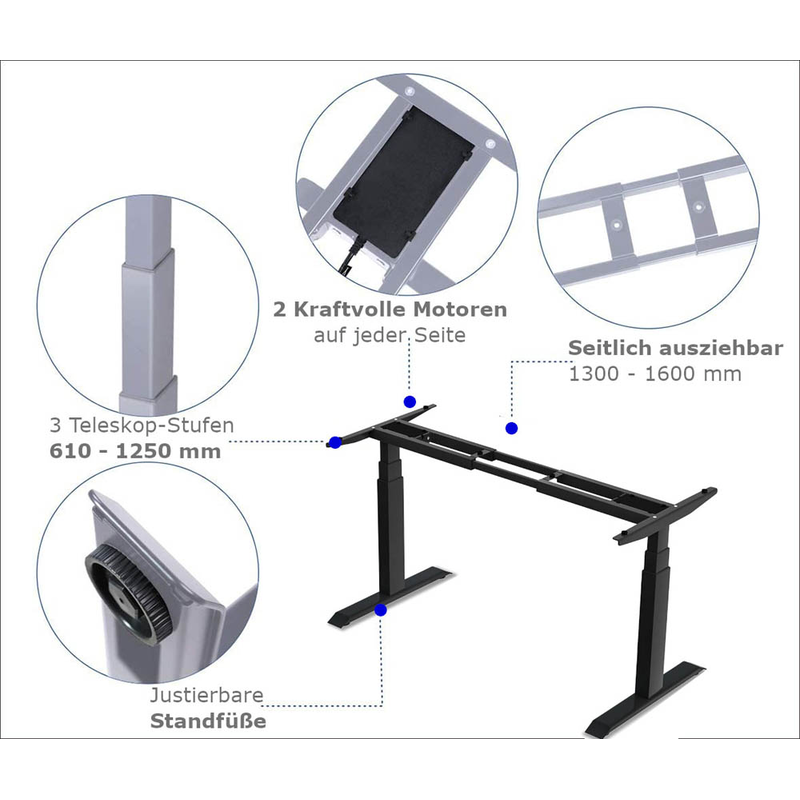 Folgende besonderen Eigenschaften besitzt Ihr neuer Arbeitsplatz: Traglast von 150,0 kg, Memory-Funktion mit Speicher, 2 Motoren, Anti-Kollisions-Technik, 3-fach Teleskop-Schub.